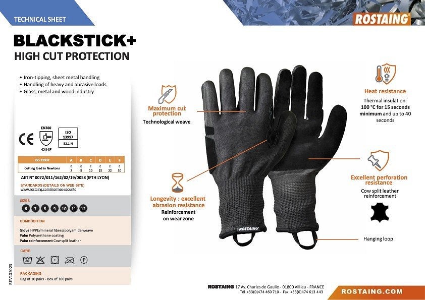 Vágásbiztos kesztyű megerősített bőr résszel vas öntés, lemezanyag kezelés Üveg-, fém- és faipar Nehéz terhek kezelése Maximális vágásvédelem Hőszigetelés: 100 °C minimum 15 másodpercig Kiváló perforációs ellenállás - hasított tehénbőr megerősítés Hosszú élettartam: kiváló kopásállóság - megerősített a kopási zónában Akasztóhurok