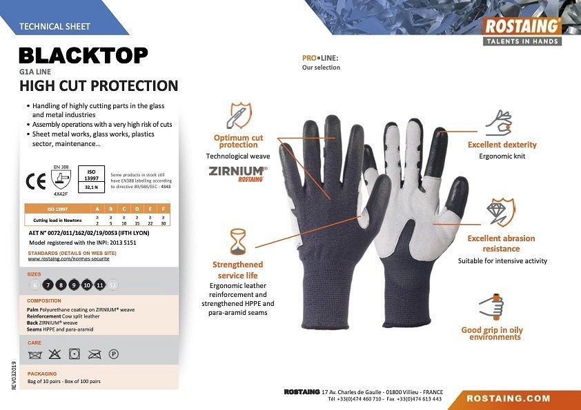 Vágásbiztos kesztyű Éles alkatrészek kezelése az üveg- és fémiparban Nagyon nagy vágási kockázattal járó összeszerelési műveletek Fémlemezgyárak, üveggyárak, műanyagipar, karbantartás Optimális vágásvédelem Kitűnő pontosság, ergonomikus szabás Kiváló kopásállóság - alkalmas intenzív tevékenységhez Jó tapadás olajos környezetben Megerősített szolgáltatási élet- ergonomikus bőr megerősítés és megerősített HPPE és para-aramid varratok