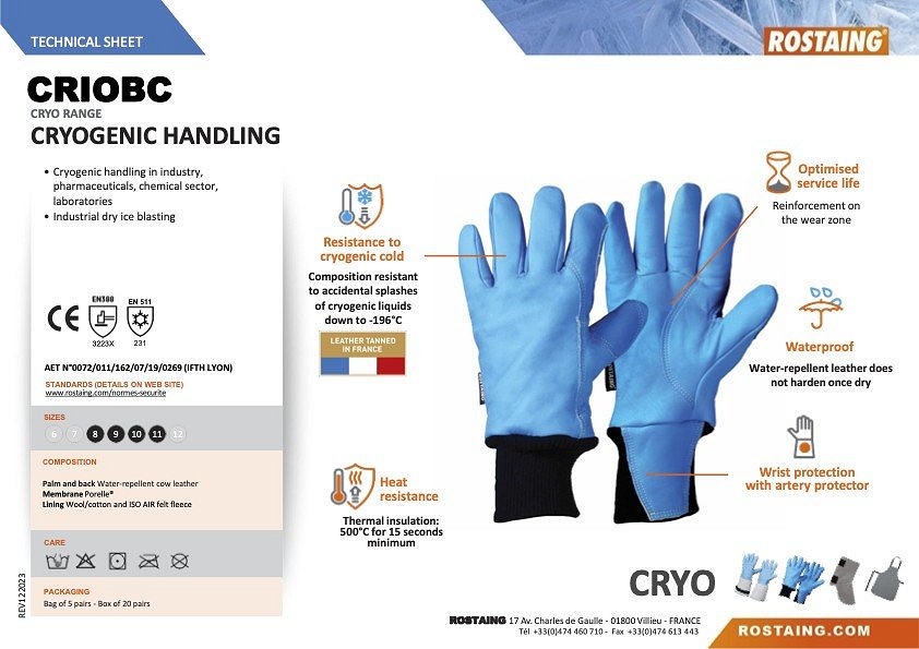 Bőrkesztyű kriogén anyagok kezelésére Kriogén kezelés az iparban, gyógyszeriparban, vegyiparban, laboratóriumokban Ipari szárazjég-fúvás Kriogén hideggel szembeni ellenállás - összetétele ellenálló a kriogén folyadékok véletlenszerű fröccsenésével szemben -196 C-ig Vízálló - vízlepergető bőr - nem keményedik meg, ha megszárad Csuklóvédelem érvédővel Optimalizált élettartam - Megerősítés a a kopási zónában Hőszigetelés: 500 °C min. 15 másodpercig