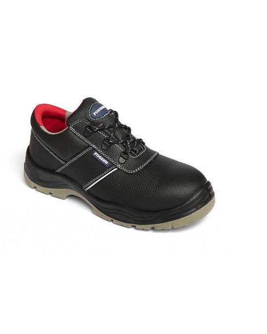 Alacsony szárú bakancs fekete szemcsés bőrből, kétszínű, szürke és piros belső béléssel, párnázott nyelvvel, szürke varrással és fényvisszaverő betétekkel, acél orrmerevítővel és nem fémes lemezzel, párnázott bokával, légáteresztő és antisztatikus kivehető talppal. Kétsűrűségű poliuretán talpbetét.