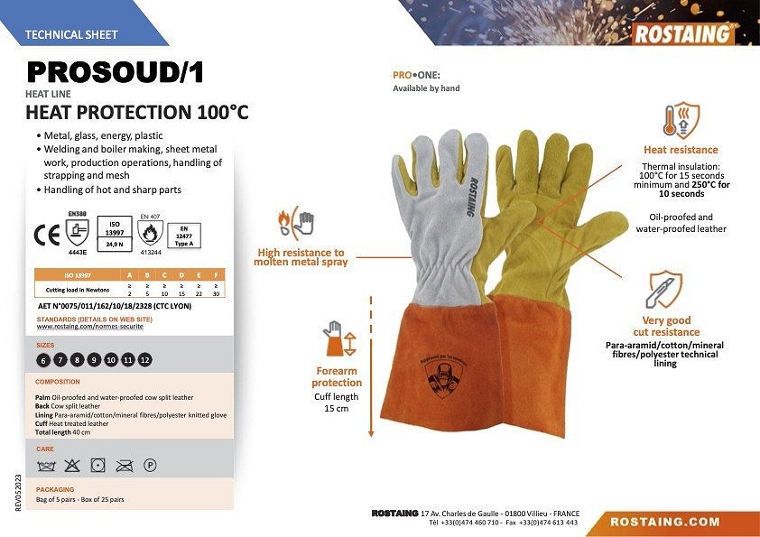 Hegesztő kesztyű HŐVÉDELEM 100°C-ig Fém, üveg, energia, műanyag Hegesztés és kazángyártás, lemezmunkák, gyártási műveletek, pántolás és háló kezelése Forró és éles alkatrészek kezelése Nagyfokú ellenállás az olvadt fém permetével szemben Nagyon jó vágásállóság Olajálló és vízálló bő Hőállóság: Hőszigetelés: 250 °C min. 10 másodpercig Alkar védelem: Mandzsetta hossz 15 cm